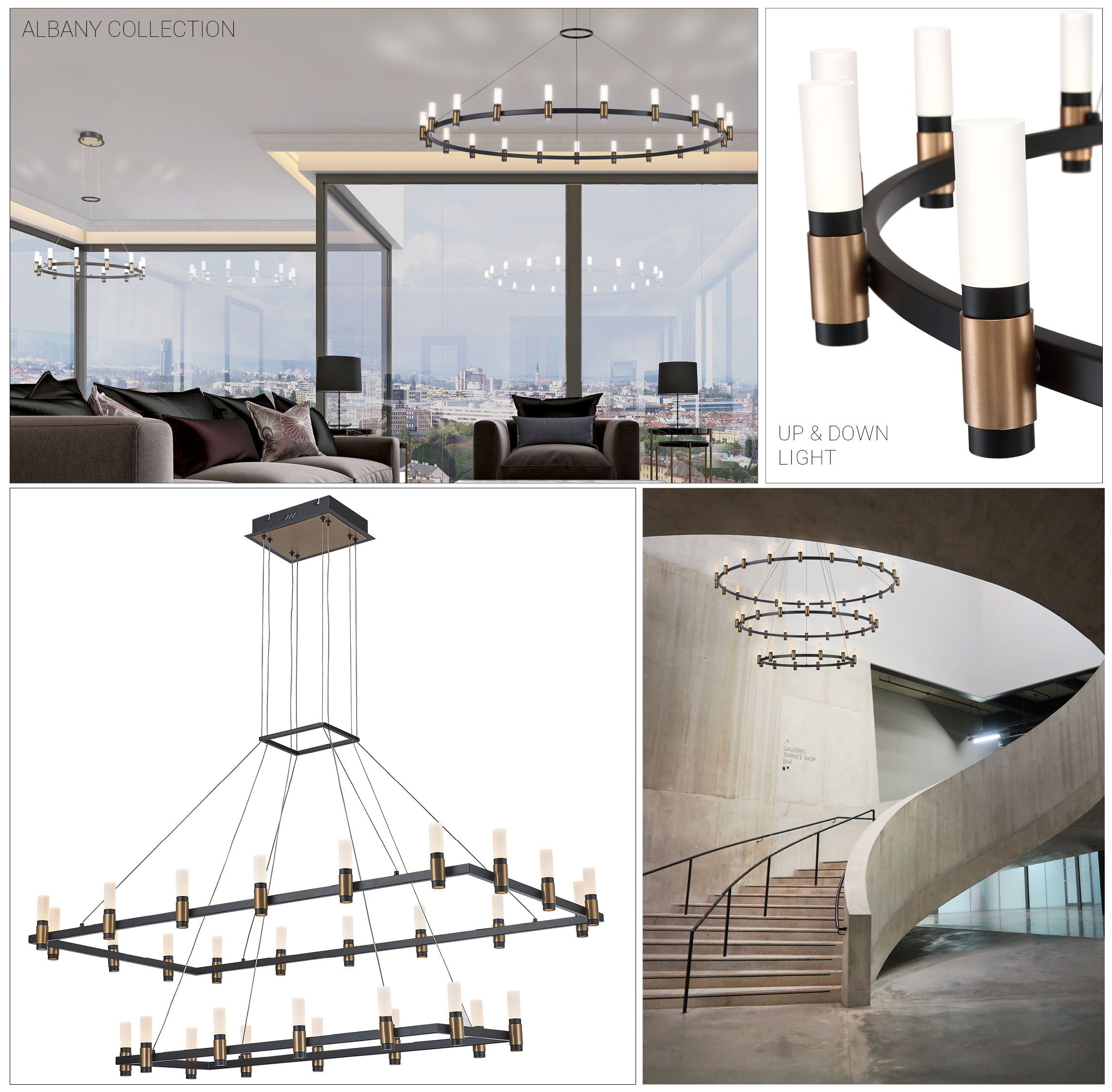 ALBANY COLLECTION – Modern black and brass candleholders anchors tubes of LED lights. The warm brass adds an inviting feel, perfect for industrial design interiors blending vintage with modern styles. Options include circular chandeliers with multiple tiers and scattered branched designs